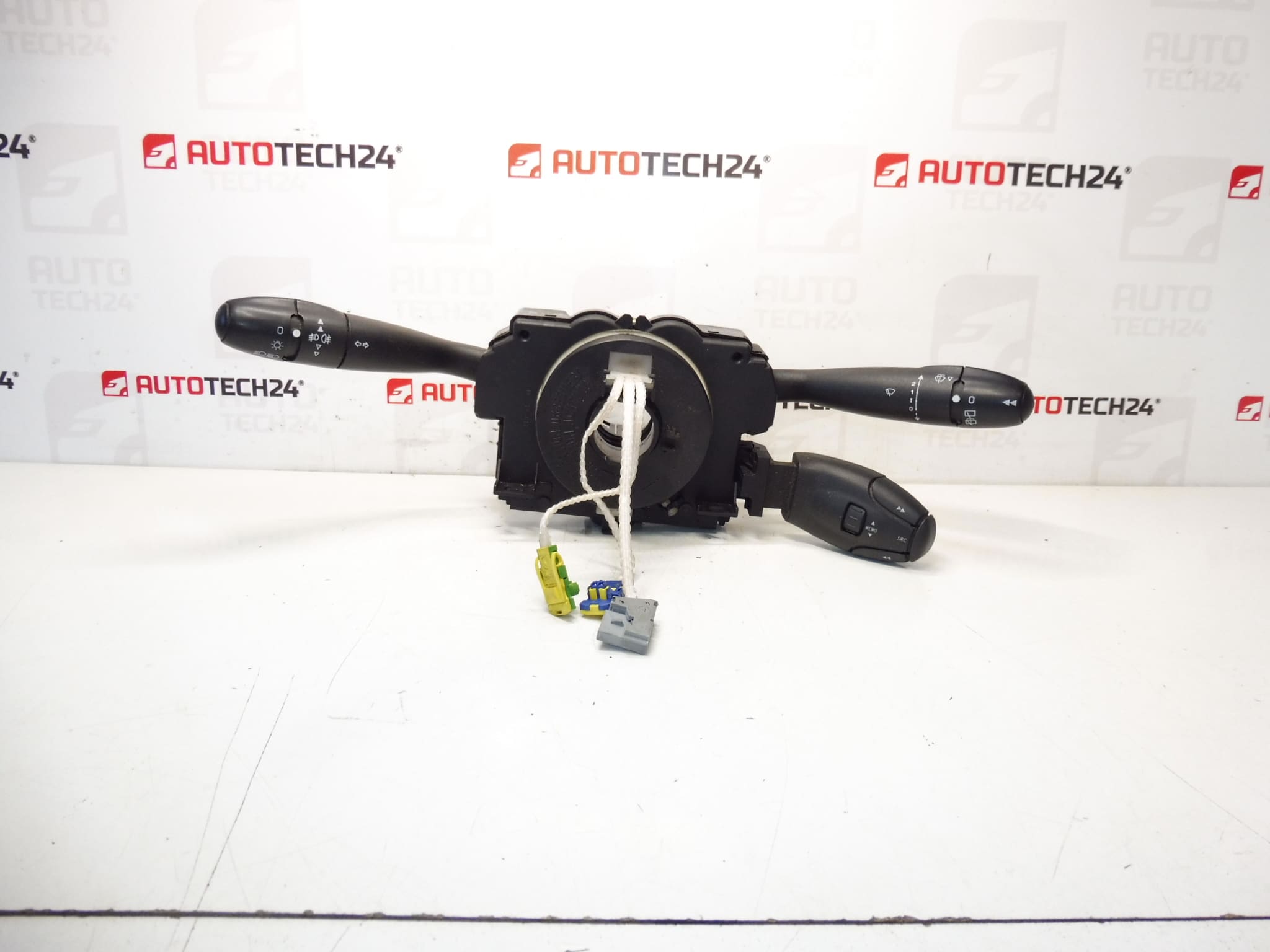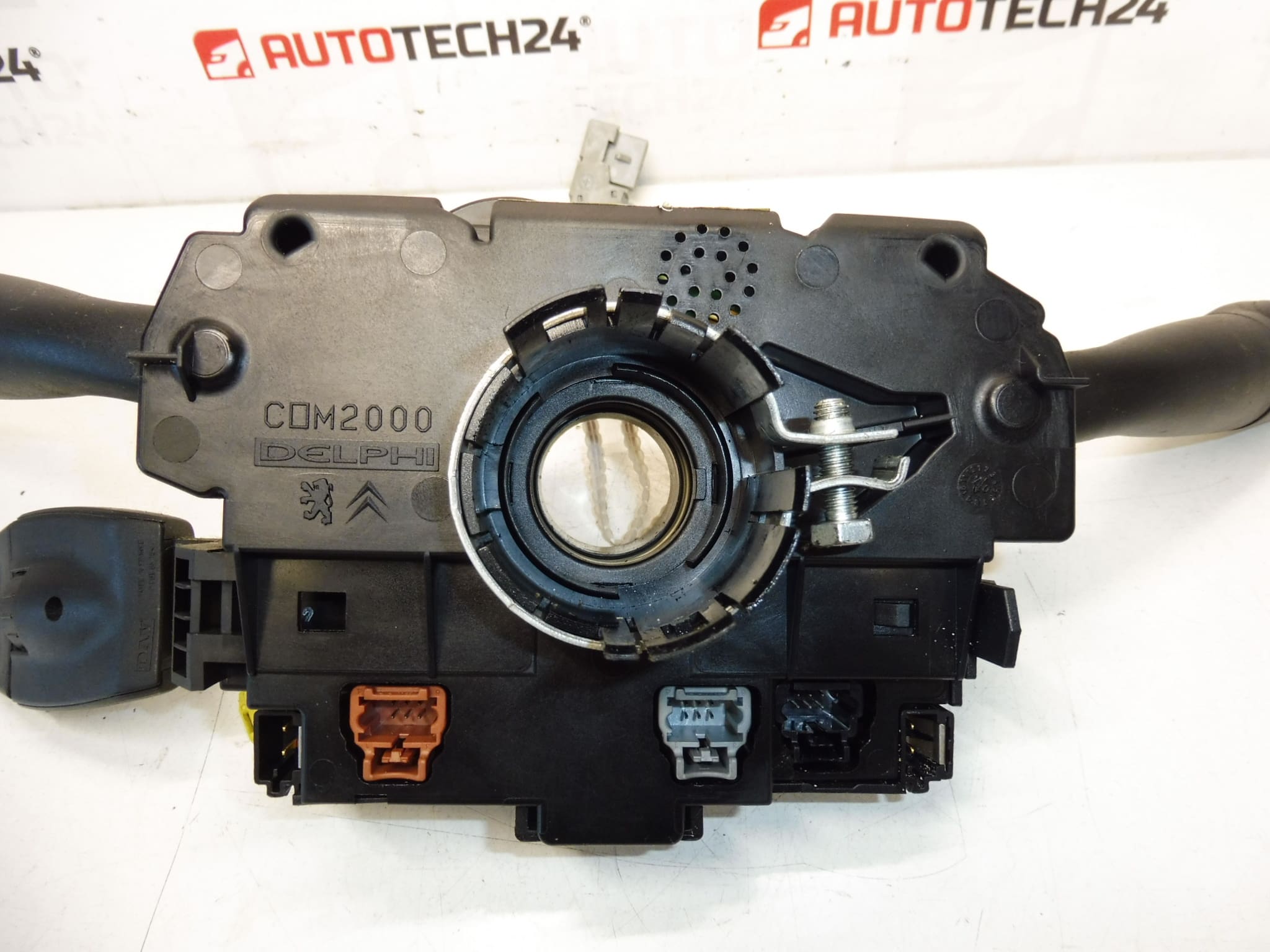 Bedieningshendels onder het stuur DELPHI COM 2000 voor Citroën en Peugeot. Ze bedienen mistlichten, boordcomputer, ruitenwisser-sensor, claxon, cruisecontrol en autoradio (bediening voor autoradio moet apart geleverd of overgezet worden).