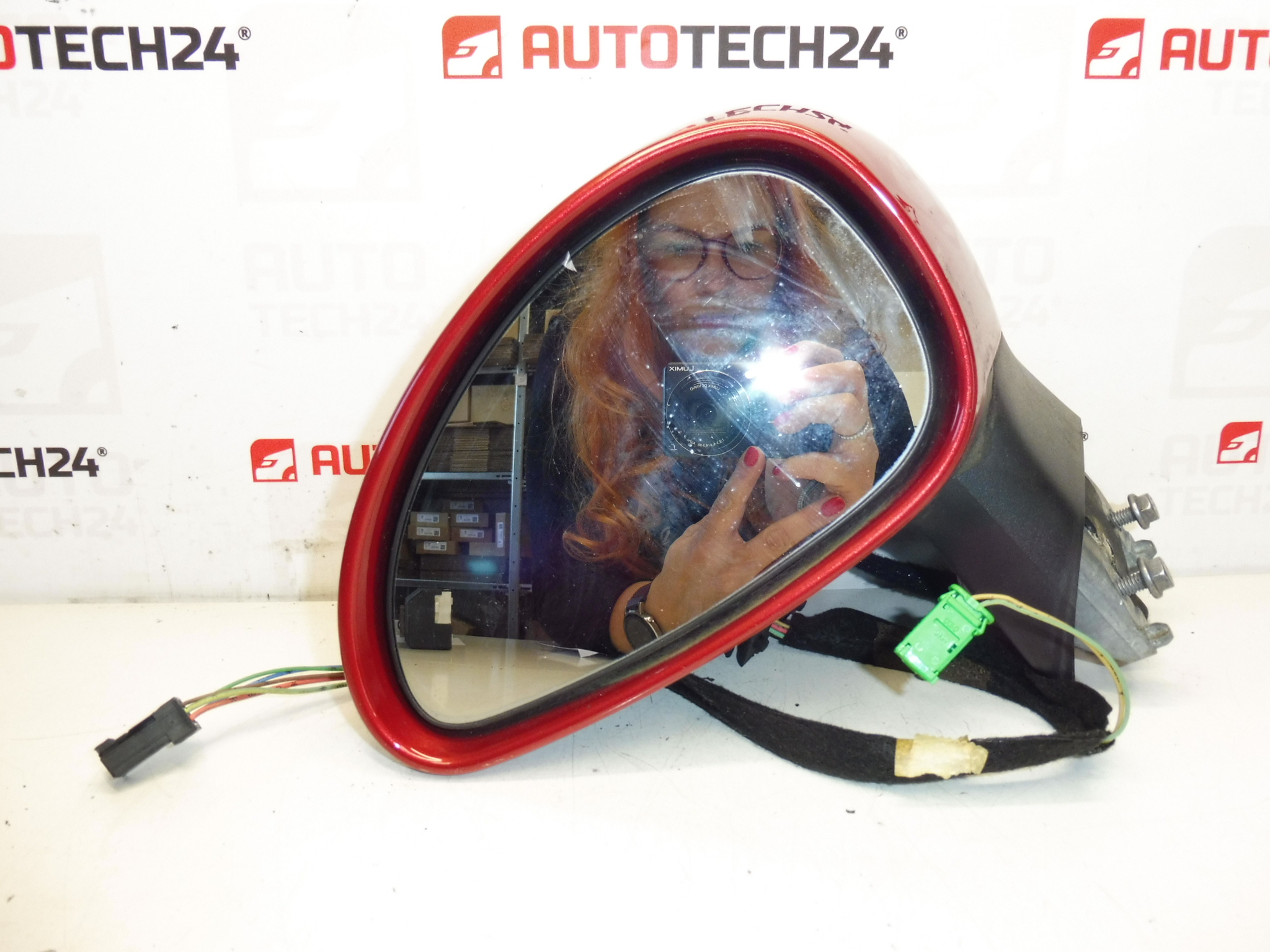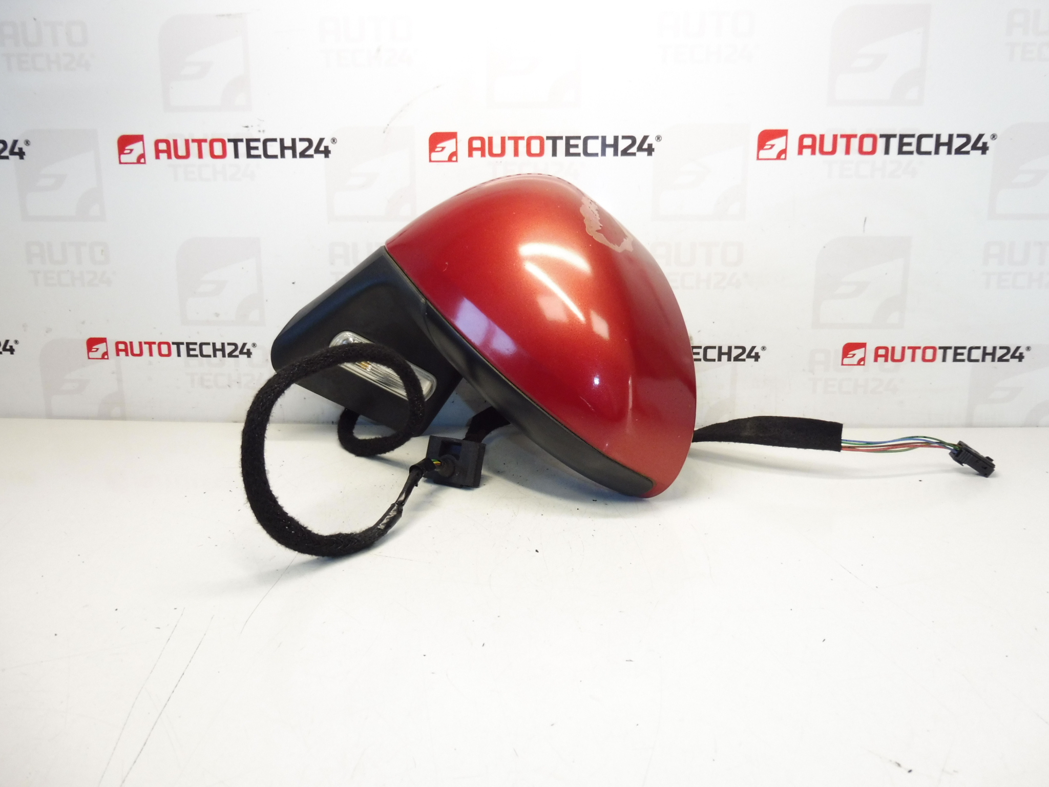 Linker buitenspiegel voor Citroën C4, elektrisch verstelbaar. Foto is authentiek – de lak is na verloop van tijd licht beschadigd. Kleur EKQD (Lucifer Rood). 7-pins (5+2). Bestuurdersdeur.