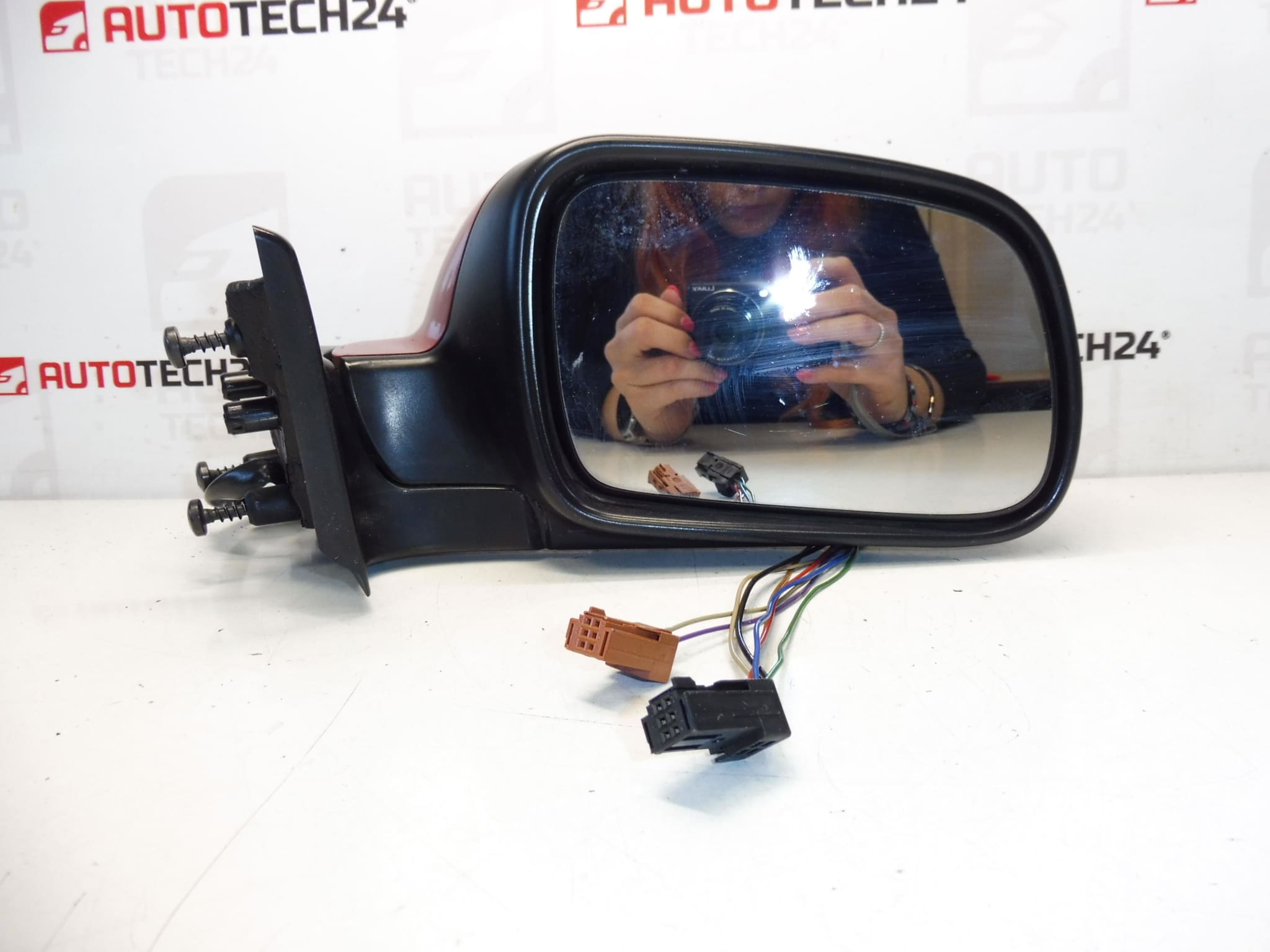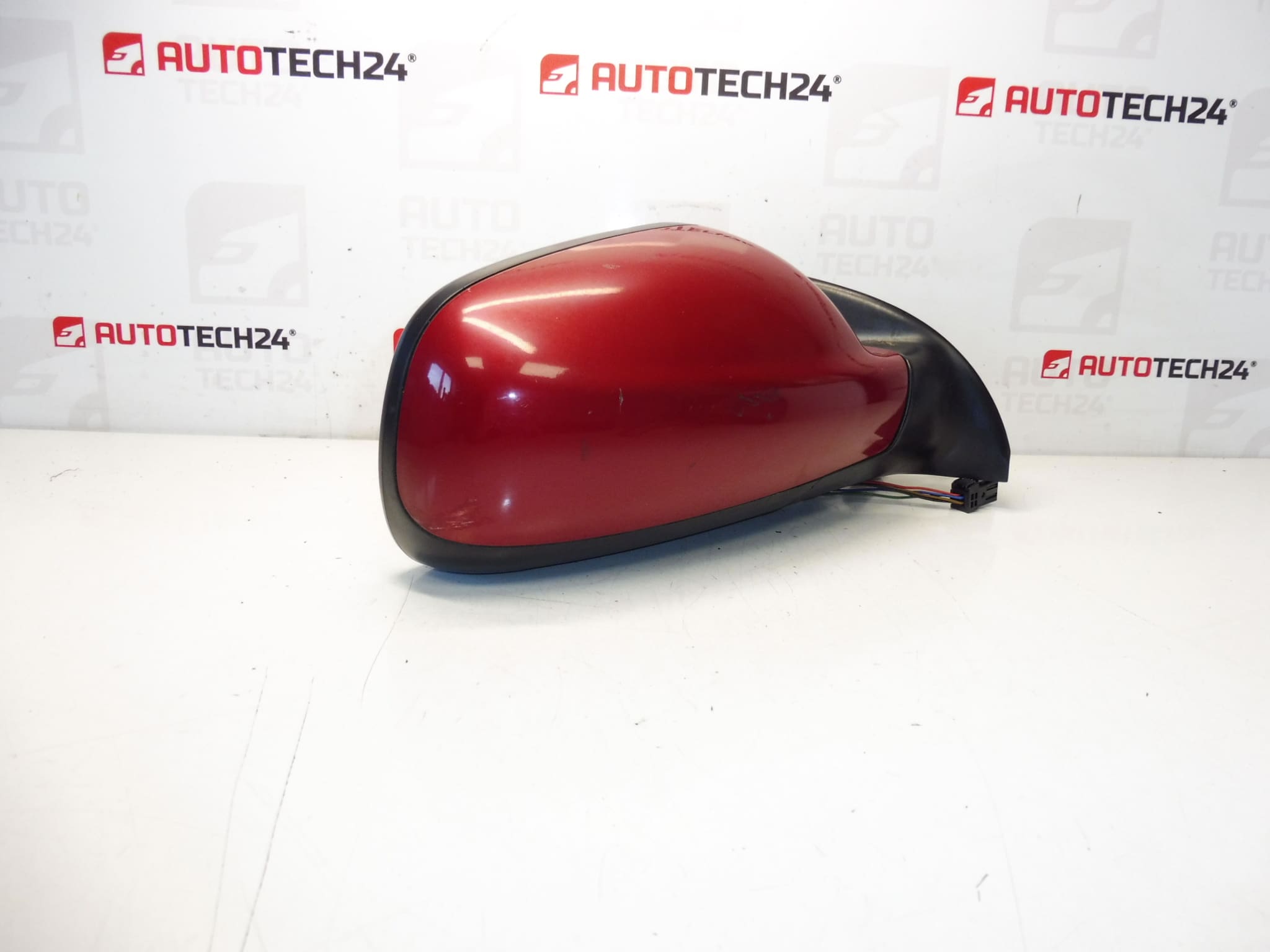 Linker buitenspiegel voor bestuurder voor Peugeot 307. Elektrisch verstelbaar en verwarmd, elektrisch inklapbaar naar het voertuig. Kleur LKR – Lak Rood Babylone. 7 PIN (5+2).